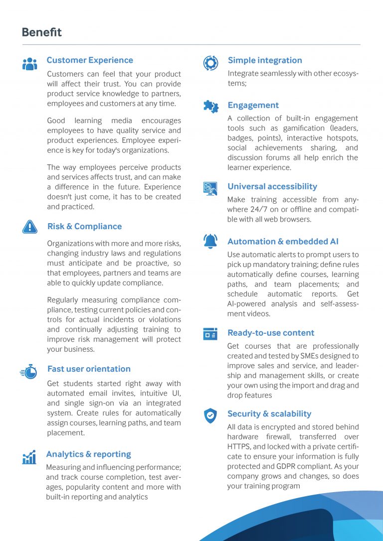 안테아는 선호되는 학습 플랫폼입니다. 다양한 보안 인증, 데이터 암호화, 고가용성 배포, 엄격한 인증 및 응용 프로그램 보안 등 다른 기능들로 안테아는 의료, 금융 및 기타 규제 산업에서 최고의 선택입니다. 안테아는 웹, 태블릿 또는 심지어 모바일 플랫폼을 통해 고객의 요구와 상황에 따라 다양한 접근 방식을 제공합니다.